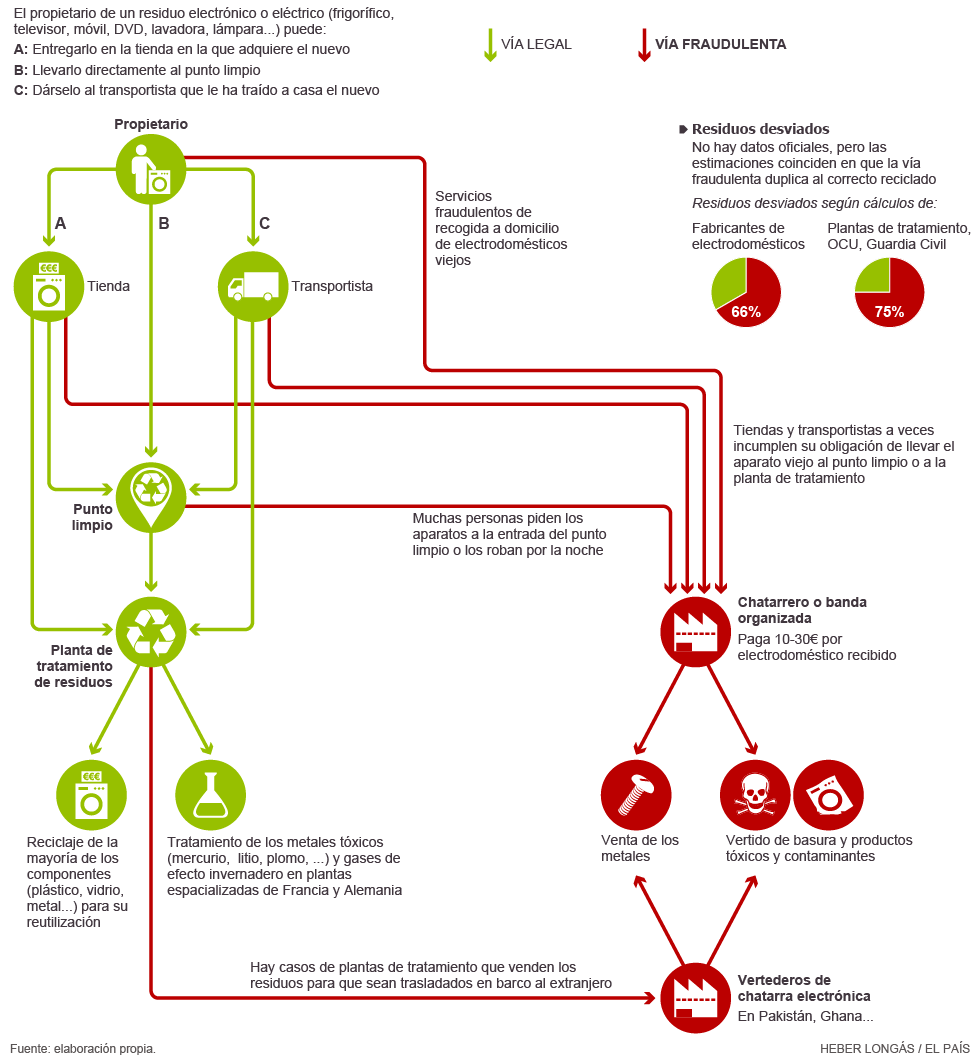 El circuito del reciclaje tiene demasiadas grietas. Las bandas asaltan los puntos limpios, que a menudo carecen de medidas de seguridad, para robar los electrodomésticos y vender sus metales por entre 10 y 30 euros. A veces se apostan en la entrada de estos depósitos para convencer a los ciudadanos de que ellos los reutilizarán y lograr que se los cedan, en vez de tirarlos. Pero el agujero más grande y habitual ocurre a diario en las casas: cuando un consumidor compra un nuevo frigorÃfico, el transportista le ofrece llevarse el aparato viejo escaleras abajo. El cliente consiente y el transportista lo revenderá a un chatarrero sin ningún control por parte del fabricante, la tienda del pueblo o la gran superficie, que ignoran su destino. De este modo, a diario se rompe la cadena del correcto reciclaje y el chatarrero o las bandas organizadas extraen el cobre y otros metales valiosos, liberando gases contaminantes a la atmósfera y abandonando los residuos en los descampados.